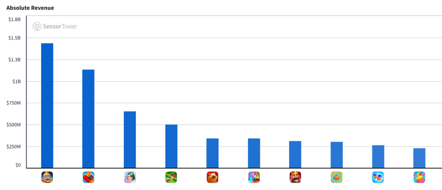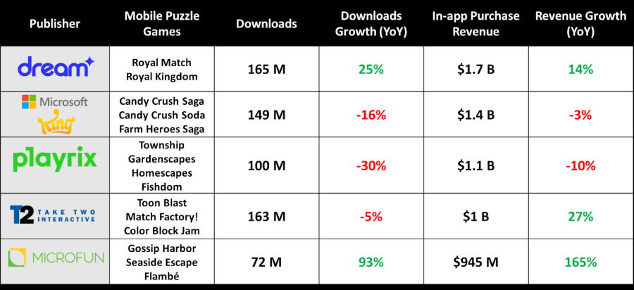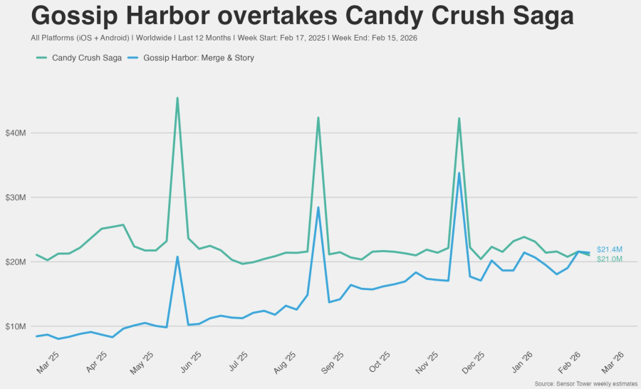 Naavik在其休闲品类分析文章《What Leading Match-3 & Merge Games Do Differently》中指出,三消游戏仍然占据市场的大盘,2025年益智类手游内购收入超过100亿美元,同比增长14%,Dream Games的《Royal Match》(14亿美元)、King的《Candy Crush Saga》(11亿美元),占据前二,第三名的《Gardenscapes》(5亿美元)则被快速崛起的《Gossip Harbor》(6.5亿美元)所取缔。