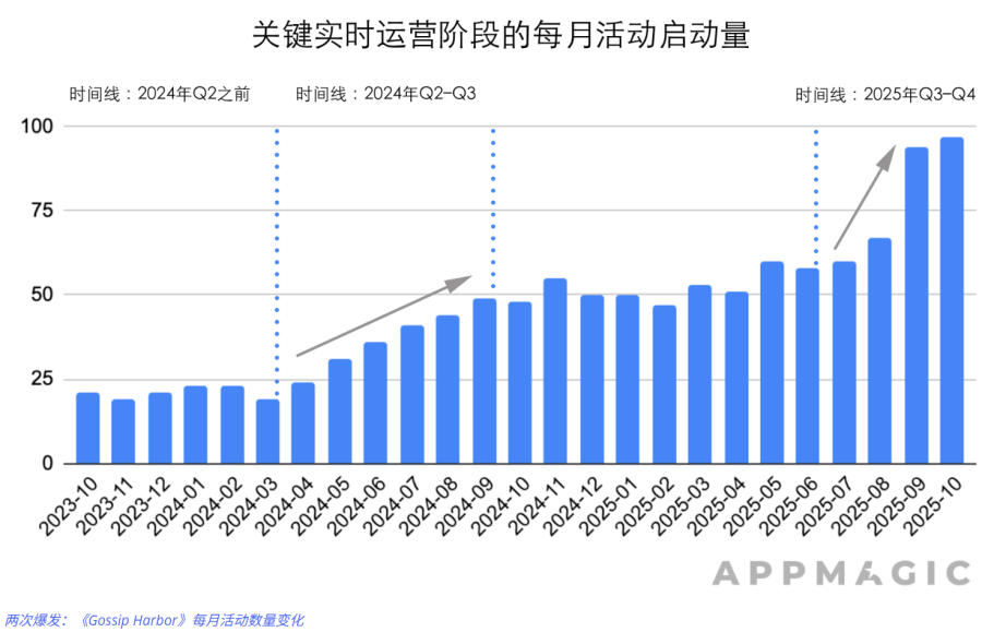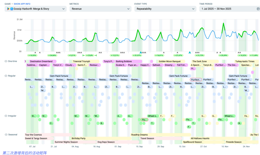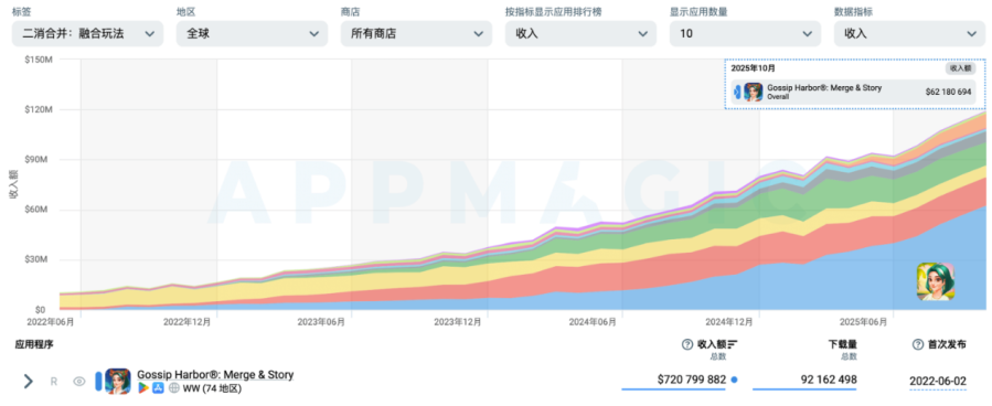 进入2024年后,《Gossip Harbor》开始统治合成游戏赛道,2024年11月凭借感恩节、黑五等一系列营销活动,收入反超《Travel Town》,2025年11月月流水达6300万美元,创下品类历史。