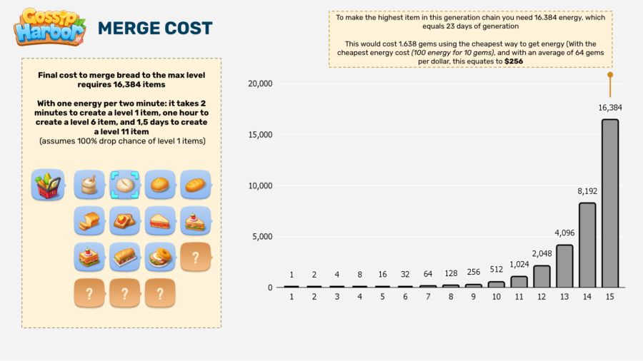 如果说《Gossip Harbor》的游戏体验是一种相对平缓的线性成长,那么《Tasty Travels》走的就是一个爆炸开局+中后期断层上升的路线,前期的慷慨的奖励与体力折扣培养玩家的消费习惯,订单需求合成物直接购买的模式也大幅加快了玩家的进度,中后期建筑升级所需金币、材料指数级上升,生成器短链合成物的模糊概率也加剧了玩家困境。