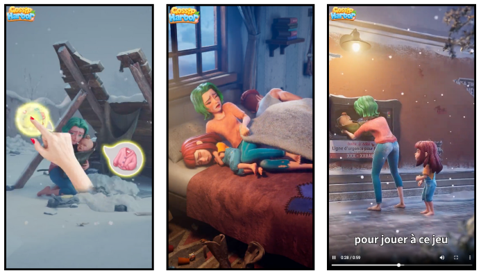 短剧凸显情节冲突的套路在游戏营销中屡试不爽,冰雪母女场景等热门素材更是引起大量厂商模仿,相比之下,《Travel Town》的早期广告多为展示合成玩法或轻微的翻修剧情,《Gossip Harbor》的强叙事性更能定位受众 并提高点击率。